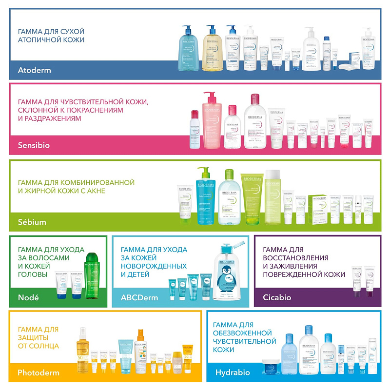 Линия средств Bioderma Atoderm разработана для ухода за атопичной, сухой, очень сухой и чувствительной кожей лица и тела. При атопическом дерматите кожа требует особого бережного ухода для устранения зуда, защиты, увлажнения и заживления кожи. Продукты Atoderm обладают высокой переносимостью, гипоаллергенны, подходят взрослым, детям и младенцам.
