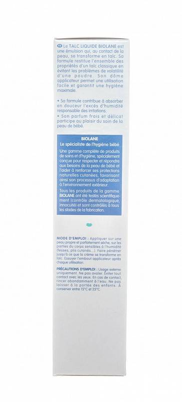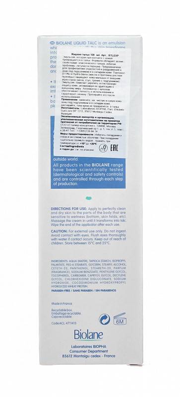 Это эмульсия, которая при контакте с кожей трансформируется в тальк. Его формула воссоздает все свойства классического талька, избегая проблемы летучести порошка. Жидкий тальк предназначен для профилактики появления опрелостей и раздражений в зоне под подгузником и в складках кожи. Пантенол (0.5%) и Hydra-bleine (масла и протеины ростков пшеницы) защищают кожу малыша от внешних агрессоров (моча, стул, трение с подгузником). Жидкий тальк помогает укрепить естественную защиту кожи, тем самым стимулируя ее адаптацию к внешнему миру. Аппликатор с куполом обеспечивает легкость в использовании и гарантирует максимальную гигиену. Свежий тонкий аромат делает процедуру ухода за кожей еще более приятной.