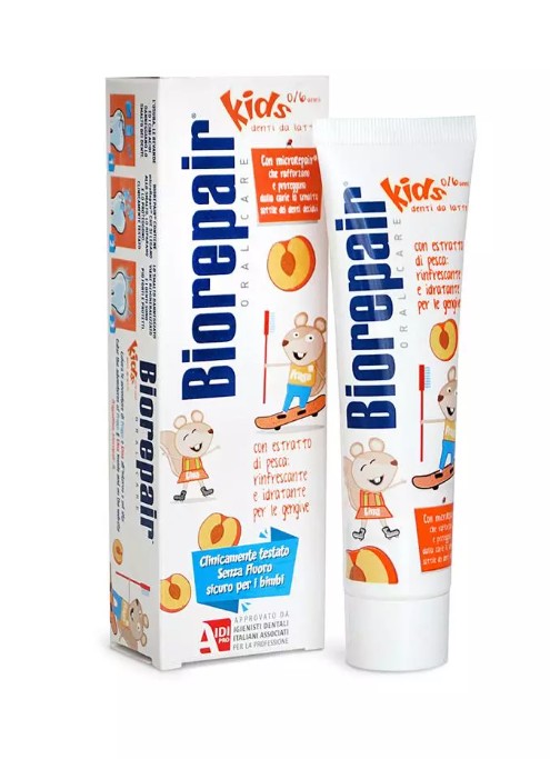 Biorepair®Kids – единственная зубная паста, содержащая частицы microRepair®, которые укрепляют эмаль молочных зубов, способствуя правильному развитию и здоровью постоянных зубов. Ее эффективность клинически-протестирована. Исключительно деликатная формула Biorepair®Kids содержит экстракт персика, который освежает и питает десны.