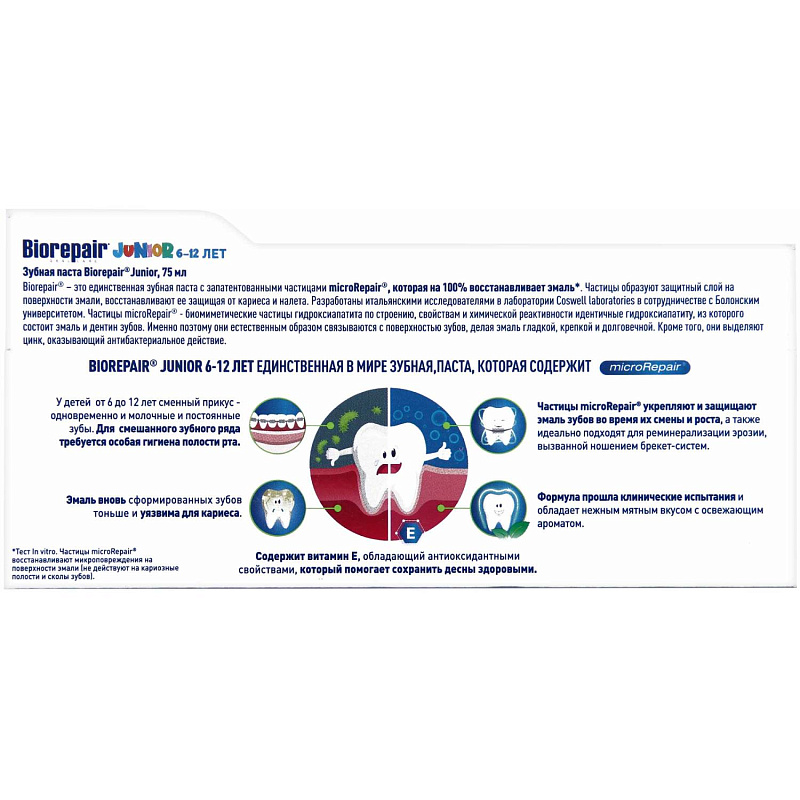 Зубная паста Biorepair® Junior обеспечит восстановление и надежную защиту эмали детских зубов от воздействия вредных кислот и сахара. Содержит витамин Е, который обеспечивает здоровье десен.