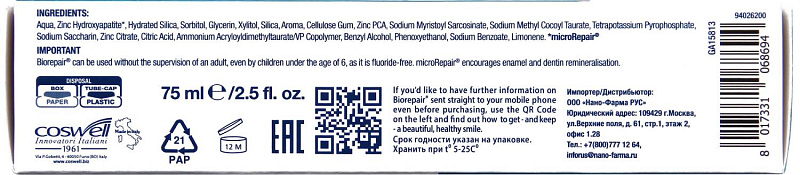 ✓Зубная паста Biorepair® содержит частицы microRepair®, в состав которых входят ионы цинка (Zn). Частицы microRepair® закрепляются на эмали, благодаря своей игольчатой форме (идентичная форма натурального гидроксиапатита эмали) и остаются на поверхности в течение 24 часов. Когда уровень pH в полости рта снижается (например, во время сна) кристаллы microRepair® распадаются на кальций, фосфаты и цинк.