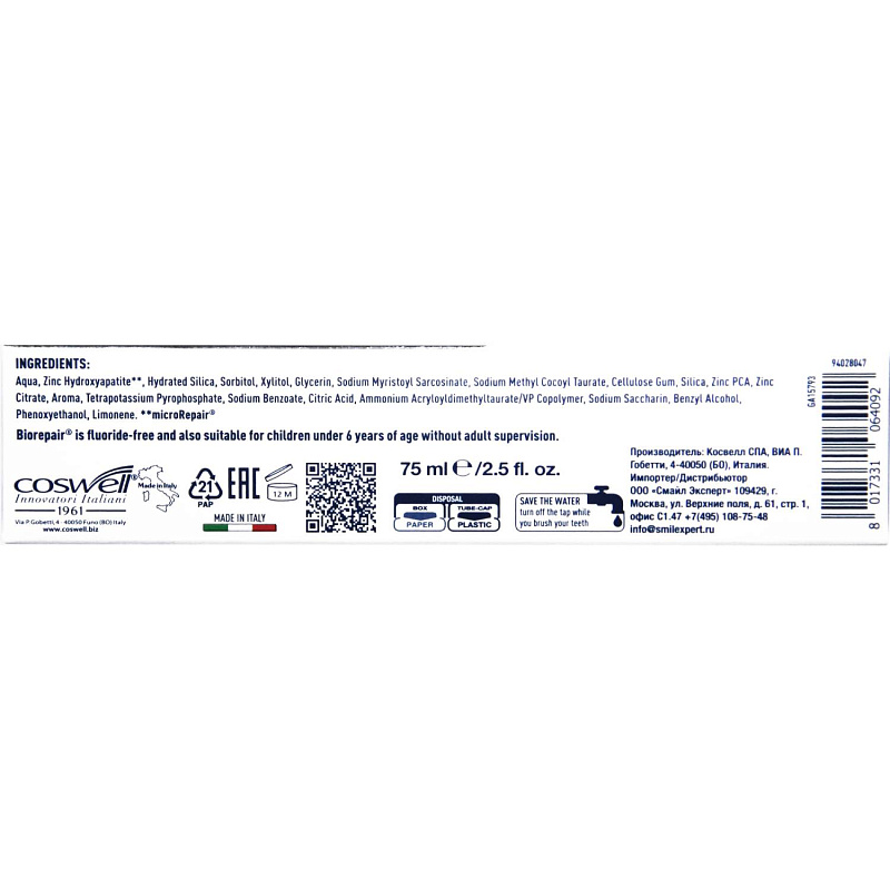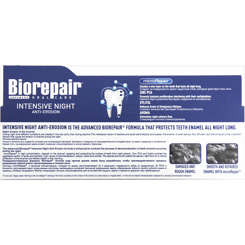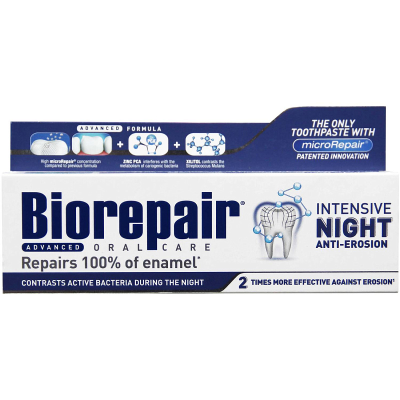 - зубная паста Biorepair содержит частицы microRepair, в состав которых входят ионы цинка (Zn). Частицы microRepair закрепляются на эмали, благодаря своей игольчатой форме (идентичная форма натурального гидроксиапатита эмали) и остаются на поверхности в течение 24 часов. Когда уровень pH в полости рта снижается (например, во время сна) кристаллы microRepair распадаются на кальций, фосфаты и цинк.