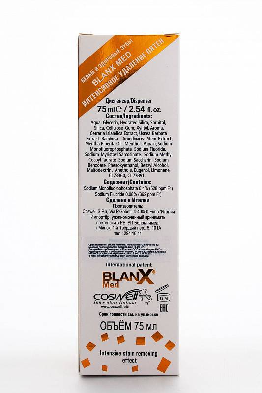 Формула BlanX® основана на натуральных экстрактах исландского мха Цетрарии и арктического лишайника Уснеи Бородовитой, благодаря которым зубная паста обладает очищающей способностью, а также противовоспалительным и противомикробным действиями.