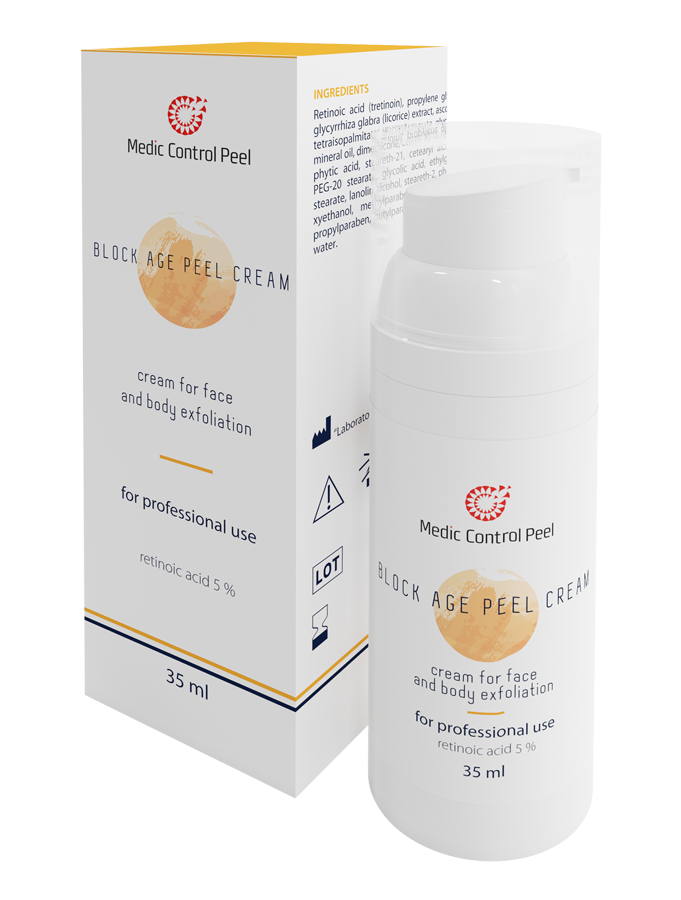 В противном случае гиперкератоз будет препятствовать пенетрации ретиноидов и значительно снизит эффективность химического пилинга. В течение 14–21 дня перед пилингом пациент должен на ночь наносить на очищенную кожу крем Prepeel Active. Утром необходимо использовать солнцезащитный крем Mediscreen Medic Control Peel.