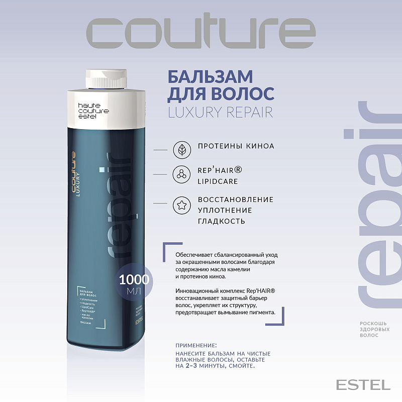 - уникальные комплексы Rep'HAIR® и LipidCare - восполняют число утерянных липидов в структуре волоса, обеспечивают здоровый блеск, гладкость, силу, мягкость и полноценную защиту цвета волос