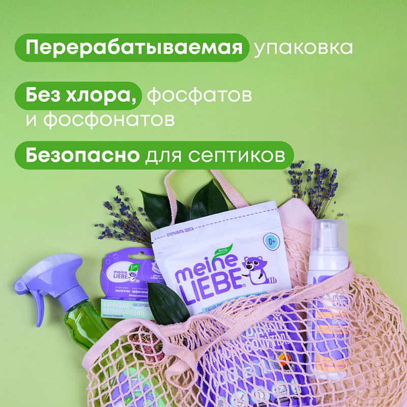 Состав и упаковка товаров биоразлагаемые, не содержат хлора, фосфатов, фосфонатов, не загрязняют окружающую среду и полностью соответствуют эко-стандартам. Бытовая химия Meine Liebe также подходит для загородных домов и дач с автономными канализациями (септиками).
