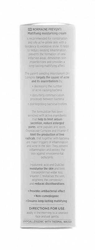 Матирующий увлажняющий крем обеспечивает длительный матирующий эффект. Действует на причины возникновения и обострения акне. Уменьшает количество бактерий, ответственных за появление акне. Нарушает межбактериальную коммуникацию и дезинтегрирует бактериальную биопленку. Ограничивает секрецию кожного сала и сокращает расширенные поры.