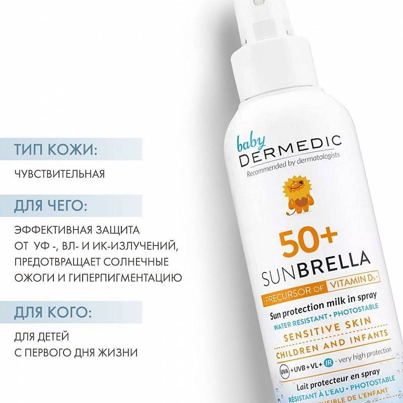 Защитное молочко-спрей для детей обеспечивает очень высокую, эффективную и длительную защиту от UVA, UVB, VL и ИК-излучения. Предотвращает солнечный дерматоз, солнечные ожоги и гиперпигментацию. Улучшает водный баланс эпидермиса и укрепляет его. Успокаивает раздражения. Содержит предшественник витамина D3, который превращается в витамин D3 под воздействием ультрафиолетового излучения.