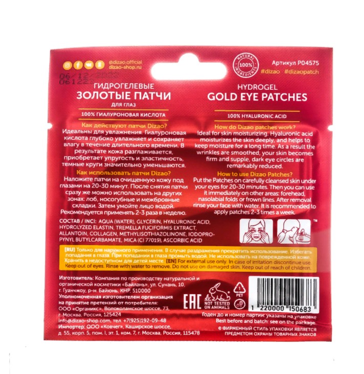 Гидрогелевые Золотые патчи для глаз 100% гиалуроновая кислота, 1 шт