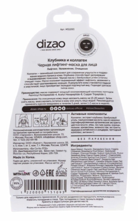 Коллаген — важнейший компонент для сохранения упругости и поддержания водного баланса кожи. Клубника способствует регенерации и выравниванию тона кожи. Черная маска с бамбуковым углем отлично очищает поры. Маска оказывает выраженный эффект лифтинга, увлажняет и способствует разглаживанию морщин. В результате кожа становится гладкой и эластичной, лицо приобретает молодой подтянутый вид.