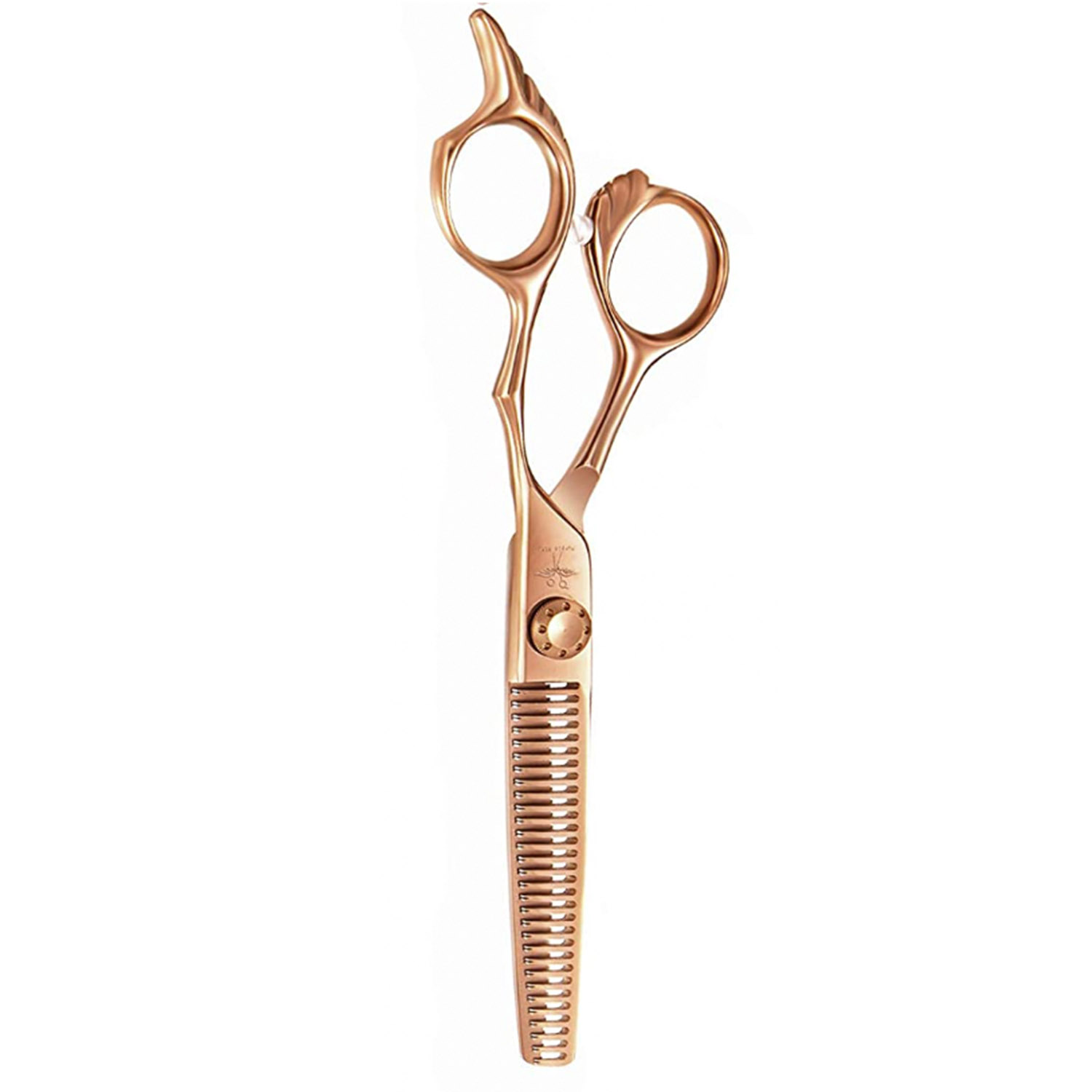 6 Дюймов Филировочные ножницы из стали ATS-314, цвета розовое золото, с 36 прямыми зазубренными зубьями и плоским центральным винтом. Процент прореживания составляет от 30% до 35%. Кованый хвостовик вместе с рукояткой Off-Set гарантирует более удобное положение локтя. В качестве механизма используется Ball Bearing, в котором установлен точный и мягкий подшипник из микросфер, обеспечивающий комфорт во время использования.