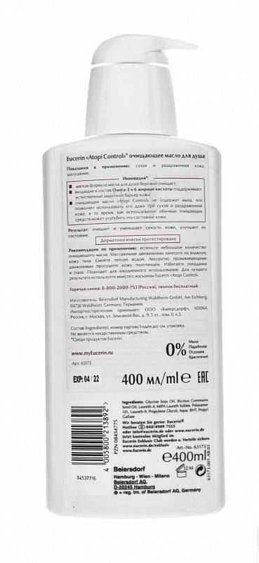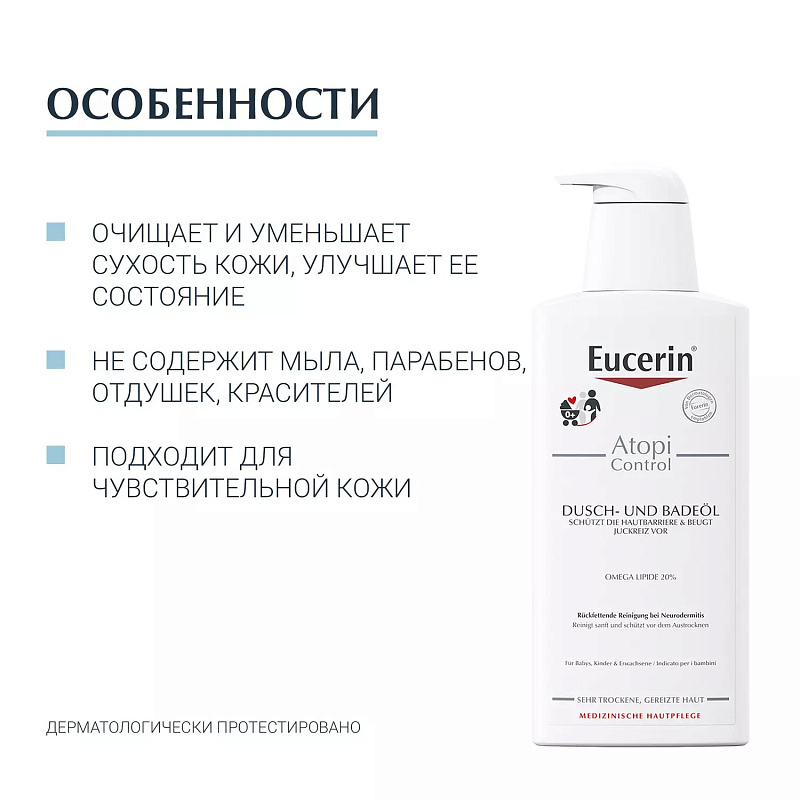 Очищающее масло для душа Eucerin ATOPI CONTROL не содержит мыла и обогащено жирными кислотами омега-3 и омега-6, которые мягко очищают и успокаивают кожу при атопическом дерматите. Средства для очищения кожи, страдающей от атопического дерматита снимают зуд и поддерживают естественный барьер кожи. Даже при регулярном мытье кожа защищена от высыхания и зуда.