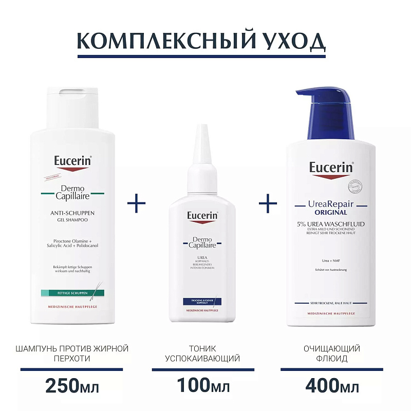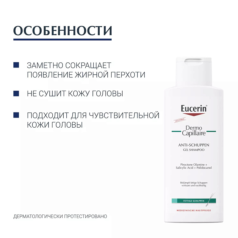 Гель-шампунь против перхоти Eucerin DERMOCAPILLAIRE специально разработан для перхоти жирной кожи головы и себорейного дерматита. Он нежно очищает кожу и волосы от липких желтых чешуек и эффективно снижает и контролирует появление перхоти. Его мягкая формула успокаивает кожу головы и снимает зуд уже после первого мытья, а его специальные кондиционирующие вещества дарят волосам здоровый блеск и делают их мягкими и послушными.