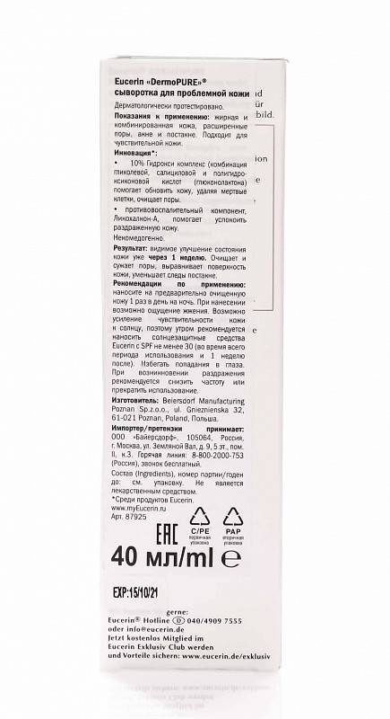 Рекомендации к использованию: Наносите на предварительно очищенную кожу 1 раз в день на ночь. При нанесении возможно ощущение жжения. Возможно усиление чувствительности кожи к солнцу, поэтому утром рекомендуется наносить солнцезащитные средства Eucerin c SPF не менее 30 (во время всего периода использования и 1 неделю после)