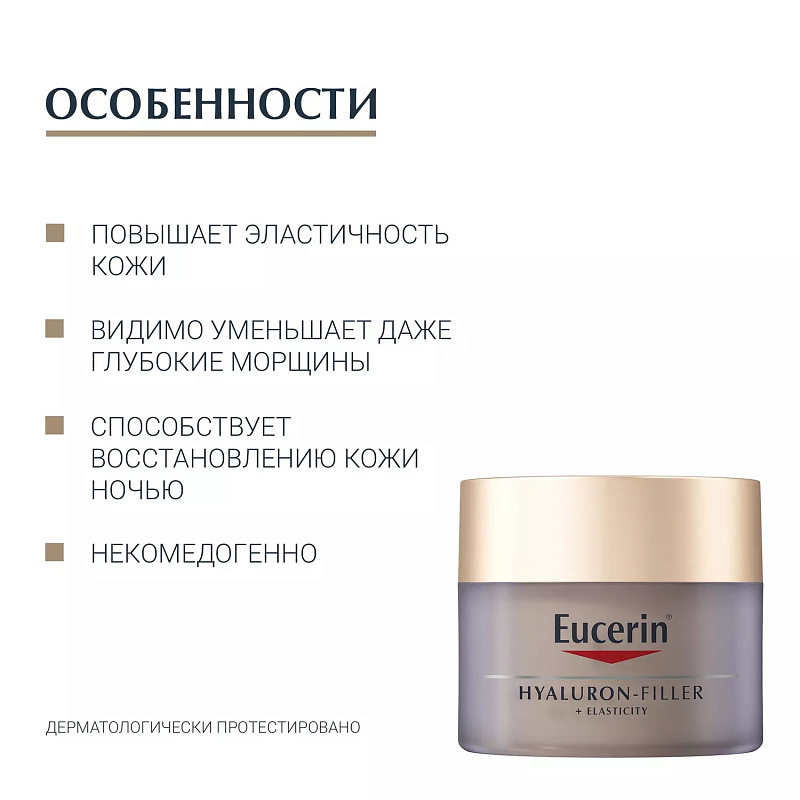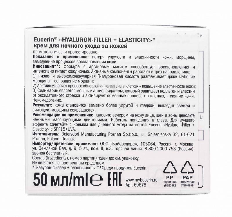 Eucerin HYALURON-FILLER + ELASTICITY — ночной крем для молодости кожи, который разглаживает глубокие морщины и улучшает эластичность кожи.