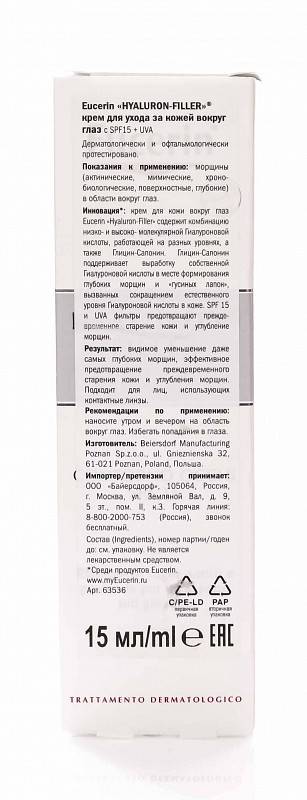 Крем для кожи вокруг глаз Eucerin HYALURON-FILLER содержит комбинацию низко- и высокомолекулярной гиалуроновой кислоты, работающей на разных уровнях, а также глицин-сапонин. Глицин-сапонин поддерживает выработку собственной гиалуроновой кислоты в месте формирования глубоких морщин и «гусиных лапок», вызванных сокращением естественного уровня гиалуроновой кислоты в коже. SPF 15 и UVA-фильтры предотвращают преждевременное старение кожи и углубление морщин.