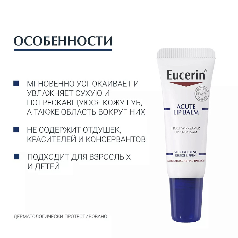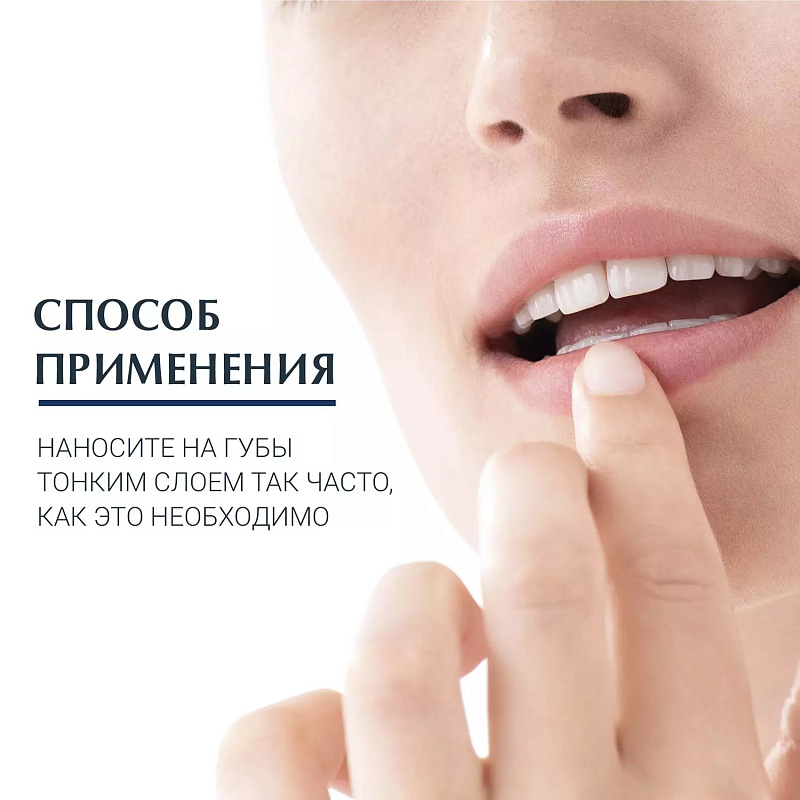 Успокаивающий и увлажняющий бальзам для губ Eucerin также подходит для применения в периоральной области (зоне вокруг рта) при таких заболеваниях, как экзема, хейлит или сухость губ из-за медицинского лечения.