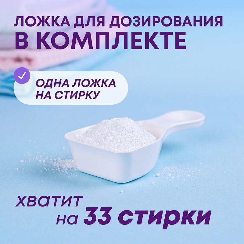 Концентрированная формула = Экономичный расход – одной упаковки хватает на 33+ стирок (при загрузке 4-5 кг), что до 5 раз экономичнее обычного порошка. В комплекте – удобная мерная ложечка для точной дозировки.