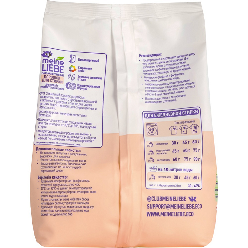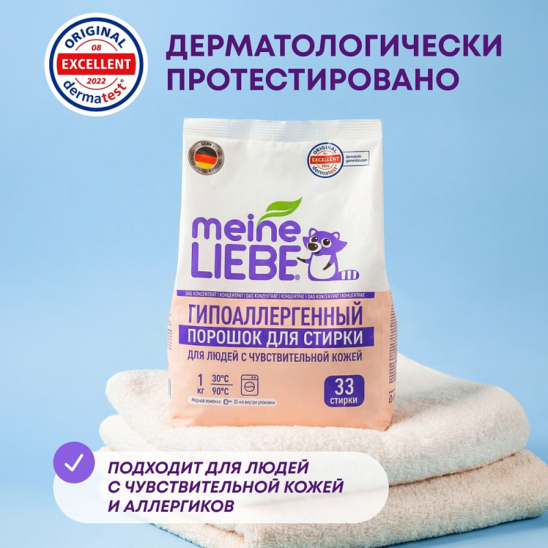 Безопасный гипоаллергенный состав – 0% агрессивных компонентов: не содержит фосфатов, энзимов, оптических отбеливателей, отдушек, красителей и нерастворимых наполнителей. Дерматологически протестирован институтом Dermatest (Германия).