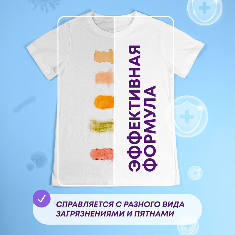 Эффективен при любой температуре – отлично отстирывает при температуре от 30 до 90 градусов, в том числе в прохладной воде и на коротких циклах. Мгновенно удаляет сложные пятна без предварительного замачивания.