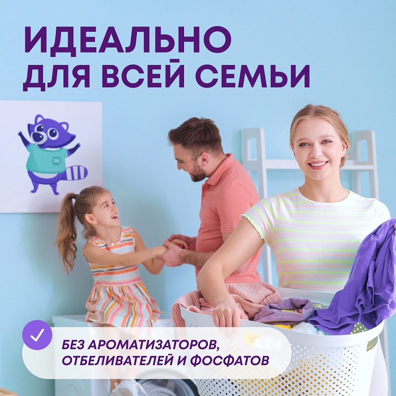 Гипоаллергенный, экологичный стиральный порошок-концентрат, специально разработанный для бережной стирки детских вещей и для людей с чувствительной кожей. Эффективно удаляет сложные загрязнения, сохраняя яркость цветных и белых тканей. Подходит для всех типов стиральных машин.