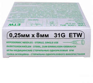 Иглы медицинские стерильные одноразовые SFM 0,25мм х 8 мм 31G ETW (50 шт/уп)Причина уценки: