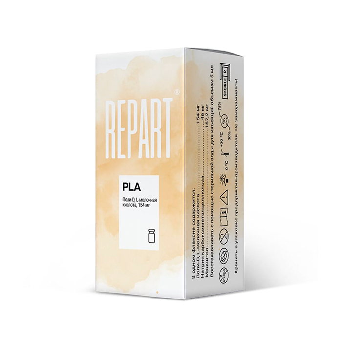Основной компонент «Repart® PLA» – поли-D, L-молочная кислота (D, L-полилактид) – биосовместимый, биодеградируемый синтетический, длительно, но полностью резорбируемый и элиминирующийся из организма полимер из группы полимеров альфа-оксикислот, введение которого в ткани человека приводит к стимуляции синтеза коллагена I и III типов.
