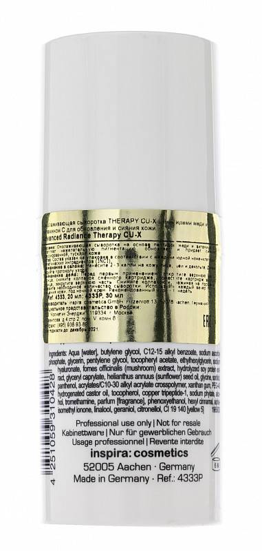 Advanced Radiance Therapy CU-X – омолаживающая сыворотка на основе пептидов меди и витамина С. Осветляет нежелательную пигментацию, обновляет и придает сияние стрессированной, тусклой коже. Это «умный» космецевтический продукт для профессионального и домашнего применения, который идеально встраивается в любую салонную anti-age процедуру. При регулярном использовании дома гарантирован максимальный результат. Подходит для всех типов кожи, для женщин и мужчин.