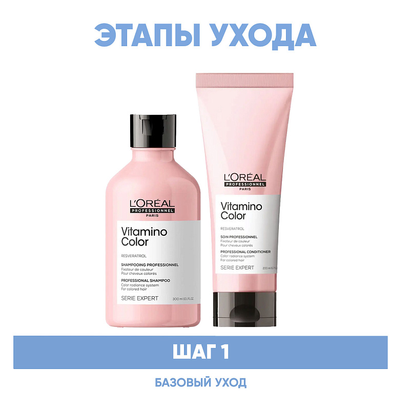 ПРОГРАММА КОМПЛЕКСНОГО УХОДА L'oreal Professionnel Vitamino Color для защиты цвета окрашенных волос. Комплексный уход представляет собой дополняющие друг друга средства, совместное использование которых будет максимально эффективным. Первым шагом программы является базовый уход (очищение + питание), вторым – дополнительный уход (средства, усиливающие эффект базовой программы и применяемые постоянно или периодически).