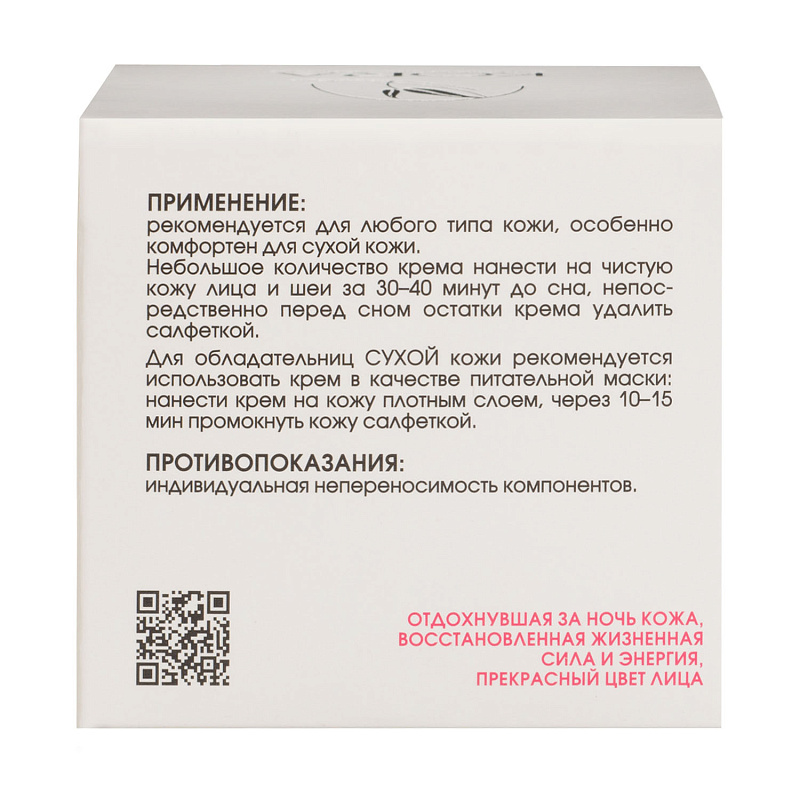 Рекомендуется для любого типа кожи, особенно комфортен для сухой кожи. Эффективен при потере упругости и эластичности зрелой кожи лица и шеи, от глубоких и поверхностных морщин и как антивозрастной крем. Небольшое количество крема нанести на чистую кожу лица и шеи за 30–40 мин до сна, непосредственно перед сном остатки крема удалить салфеткой. Для обладательниц СУХОЙ кожи рекомендуется использовать крем в качестве питательной маски: нанести крем на кожу плотным слоем, через 10-15 мин промокнуть кожу салфеткой.