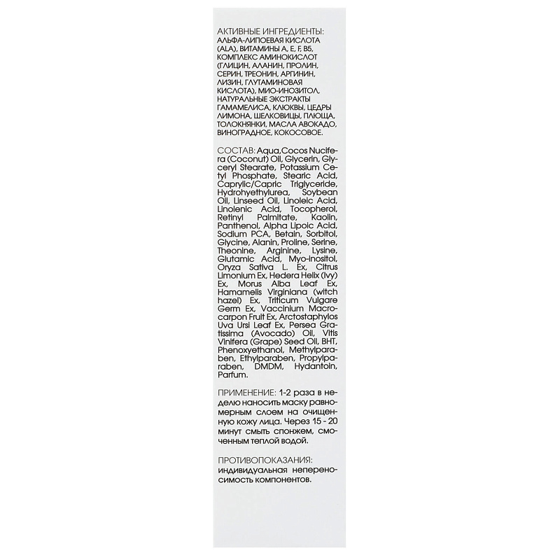 Состав: aqua, cocosnucifera (coconut) oil, glycerin, glyceryl stearate, potassium cetyl phosphate, stearic acid, caprylic/capric triglyceride, urea, soybean oil, linseed oil, linoleic acid, linolenicasid, tocopherol, retinylpalmitate, kaolin, alpha lipoic acid, sodium pca, betain, sorbitol, glycine, alanin, proline, serine, theonine, arginine, lysine, glutamic acid, myo-inositol, oriza sativa l. extract, citrus limonium extract, hedera helix (ivy) extract, morus alba leaf extract, hamamelisvirginiana (witch hazel) extract,triticumvulgare germ extract, vacciniummacrocarpon fruit extract, arctostaphylosuvaursi leaf extract, perseagratissima (avocado) oil,vitisvinifera (grape) seed oil, arginine, внт, phenoxyethanol, methylparaben, ethylparaben, propylparaben, dmdm hydantoin, parfum.