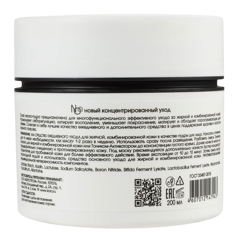 Сухая маска-пудра предназначена для многофункционального эффективного ухода за жирной и комбинированной кожей. Нормализует себорегуляцию, купирует воспаления, уменьшает покраснения, матирует и обладает поросуживающим действием. Сочетает в себе лучшие качества ежедневного и дополнительного средства в целях поддержания здоровья и красоты кожного покрова.