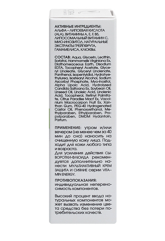 Альфа – липоевая кислота (ALA), витамины А, Е, F, В5, липосомальный витамин С, мио-инозитол, натуральные экстракты грейпфрута, гамамелиса, клюквы.