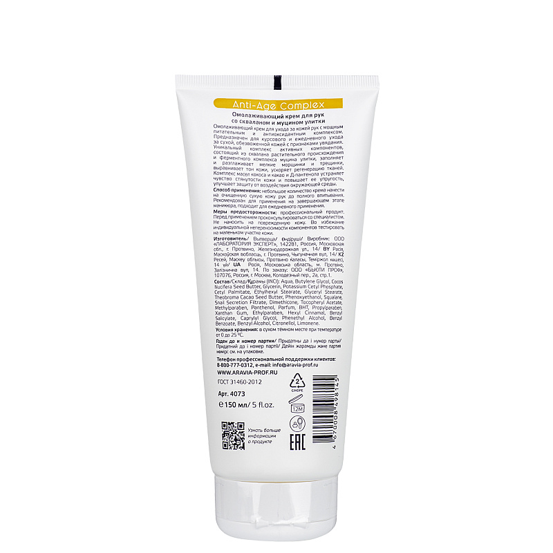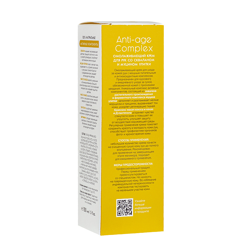 Омолаживающий крем для ухода за кожей рук с мощным питательным и антиоксидантным комплексом. Предназначен для курсового и ежедневного ухода за сухой, обезвоженной кожей с признаками увядания. Уникальный комплекс активных компонентов, состоящий из сквалана растительного происхождения и ферментного комплекса муцина улитки, заполняет и разглаживает мелкие морщинки и трещинки, выравнивает тон кожи, ускоряет регенерацию тканей. Комплекс масел кокоса и какао и Д-пантенола, устраняет чувство стянутости кожи и повышает ее упругость, улучшает защиту от воздействия окружающей среды. Регулярное применение крема помогает сохранить красоту и молодость кожи рук, способствует профилактике признаков фото- и хроностарения кожи.