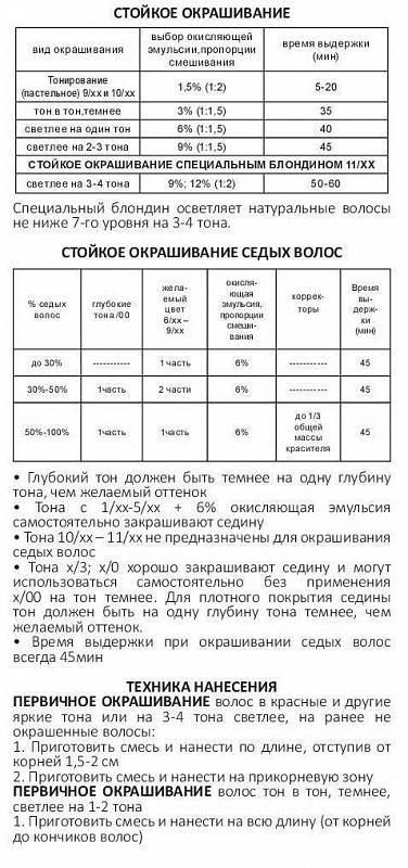 • для оттенков Основной палитры с 1/хх по 10/хх ряд - в пропорции 1:1,5 (краситель 60 мл + окислитель 90 мл)