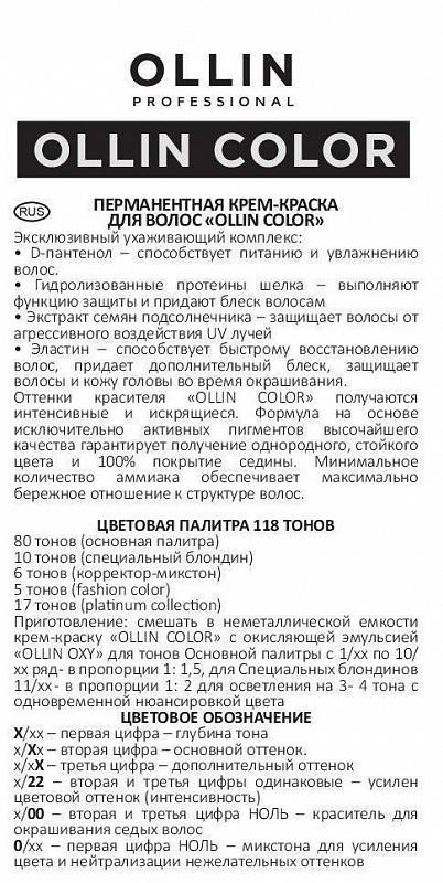 OLLIN Color - перманентный краситель (крем-краска) с низким содержанием аммиака для создания ярких, насыщенных оттенков. Инновационная формула с содержанием активных пигментов самого высочайшего качества гарантирует получение однородного цвета и сто процентное покрытие седины.