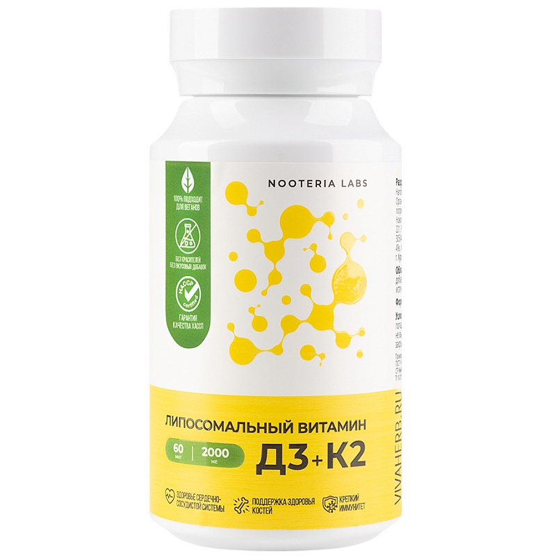 Липосомальный витамин Д3 + К2 – форма, где витамины D3 и K2 заключены в липосомы — микрочастицы, которые нужны для более легкого усвоения организмом без побочных эффектов и раздражающего действия на ЖКТ.