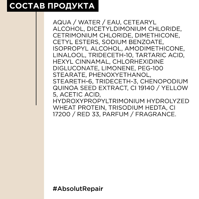 Состав: aqua/water/eau, cetearyl alcohol, dicetyldimonium chloride, cetrimonium chloride, dimethicone, cetyl esters, sodium benzoate, isopropyl alcohol, amodimethicone, linalool, trideceth-10, tartaric acid, hexyl cinnamal, chlorhexidine digluconate, limonene, peg-100 stearate, phenoxyethanol, steareth-6, trideceth-3, chenopodium quinoa seed extract, ci 19140 / yellow 5, acetic acid, hydroxypropyltrimonium hydrolyzed wheat protein, trisodium hedta, ci 17200/red 33, parfum/fragrance. c228937/2.