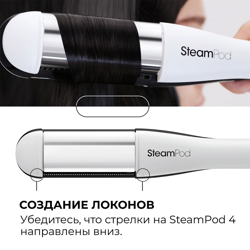 Затем медленно продвигайтесь стайлером Steampod по локону вниз, вращая щипцы вокруг своей оси в вертикальном положении, не задерживая надолго стайлер на одном месте (стрелки на приборе должны указывать вниз).