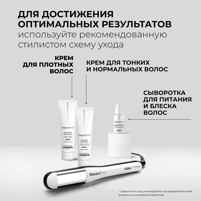 Предварительно нанесите на влажные волосы крем Steampod, активируемый паром (в соответствии с типом волос), и подсушите феном.