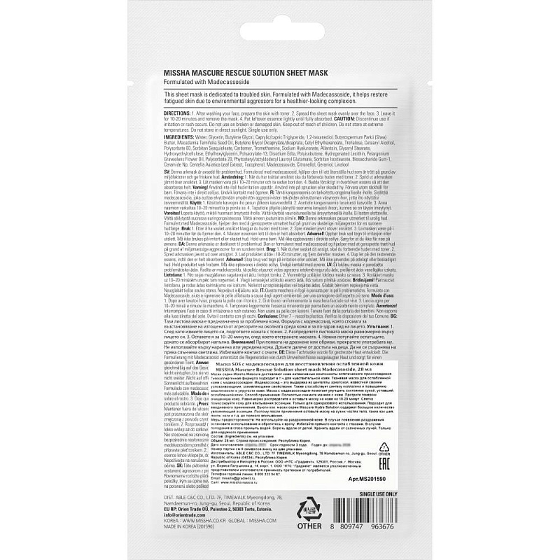 Тканевая маска для лица Mascure Rescue восстанавливающая с мадекасосидом и центеллой азиатской, 28 мл