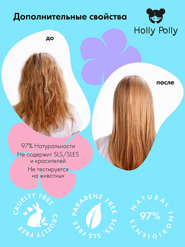 Не содержит парабенов, красителей, PEG, SLS/SLES и не тестировалась на животных. В составе 97% натуральных ингредиентов, включая масла брокколи и кокоса, гуар катионный, амодиметикон.