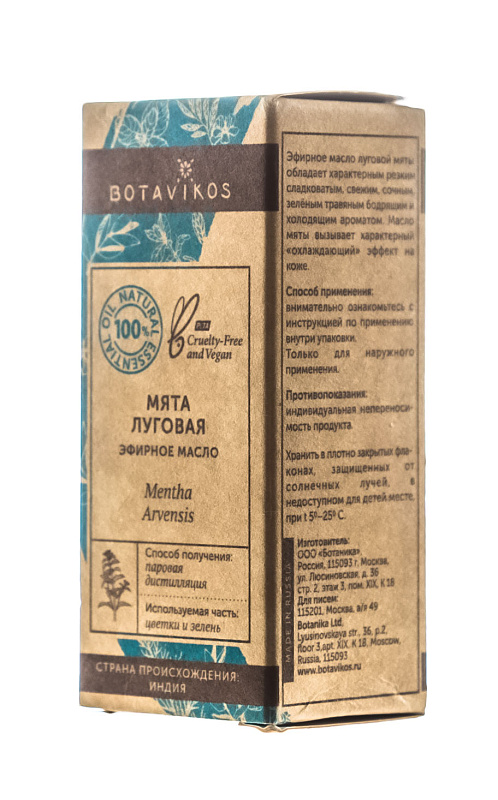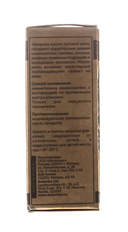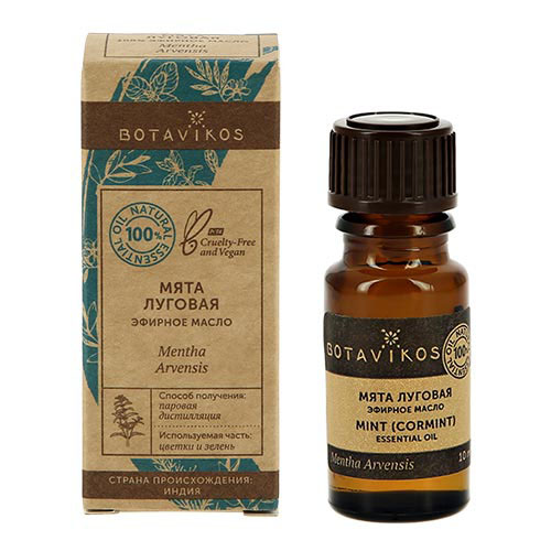 Эфирное масло луговой мяты обладает характерным резким сладковатым, свежим, сочным, зелёным травяным бодрящим и холодящим ароматом. Масло мяты вызывает характерный «охлаждающий» эффект на коже.