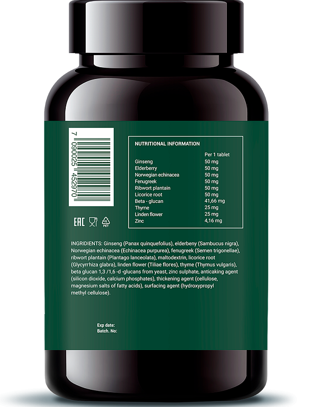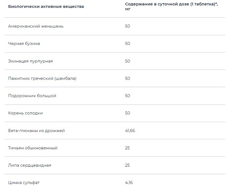 Состав: мальтодекстрин, микрокристаллическая целлюлоза E460i (носитель), корень женьшеня, плоды бузины, эхинацея, семена пажитника, подорожник большой, корень солодки голой, 1,3/1,6 –d – глюкан из дрожжей, тимьян обыкновенный, цветки липы, стеарат магния E 470b (эмульгатор), трикальция фосфат E341iii (стабилизатор), диоксид кремния E551 (антислеживающий агент), цинка сульфат.