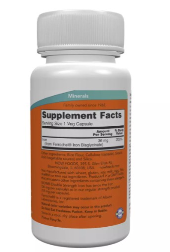 Феррохель® является зарегистрированным товарным знаком Лабораторий Альбион , Inc. Now® Double Strength Iron содержит вдвое больше железа (36 мг на капсулу).