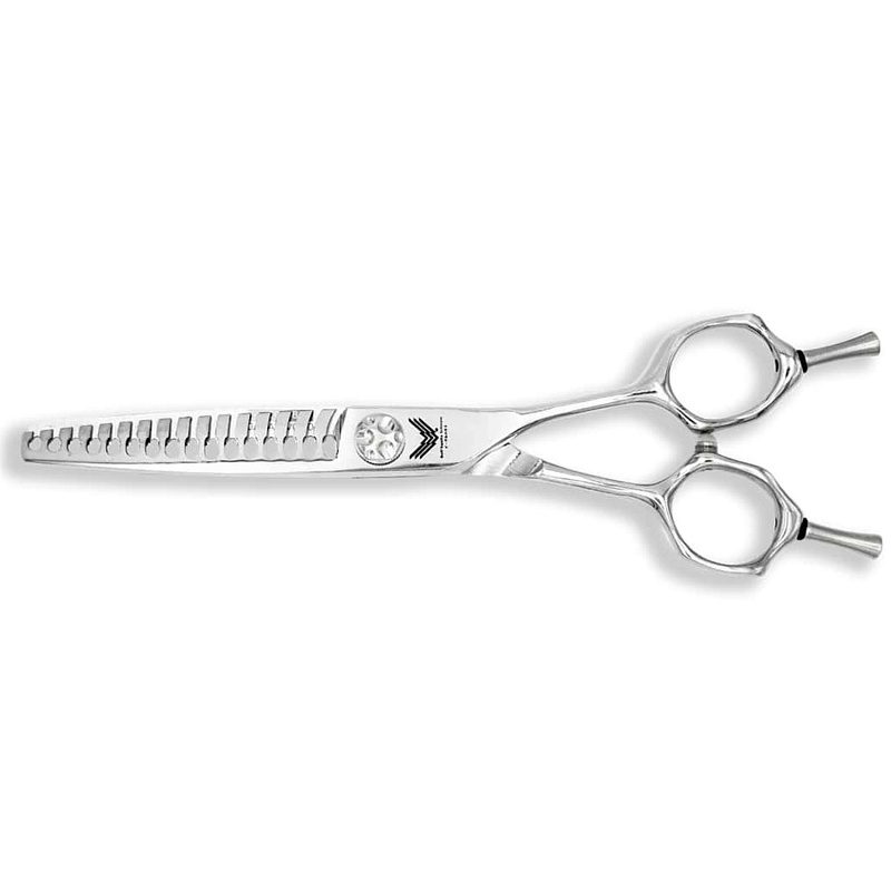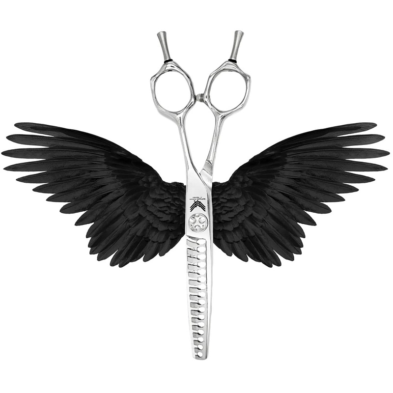 6 Дюймов Филировочные ножницы из стали Japan VG-10 с 16 изогнутыми зубьями на переднем лезвии. У него также есть зубья на заднем лезвии. Рельефный регулировочный винт. Процент прореживания составляет от 20% до 25%. В основном используется для текстурирования или придания направления волосам. Симметричная ручка позволяет использовать ножницы в обоих направлениях. В качестве механизма используется Ball Bearing, в котором установлен точный и мягкий подшипник из микросфер, обеспечивающий комфорт во время использования.