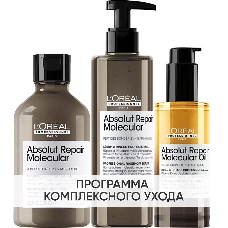 ПРОГРАММА КОМПЛЕКСНОГО УХОДА L'Oreal Professionnel Absolut Repair Molecular для поврежденных волос. Комплексный уход представляет собой дополняющие друг друга средства, совместное использование которых будет максимально эффективным. Первым шагом программы является базовый уход (очищение + питание).