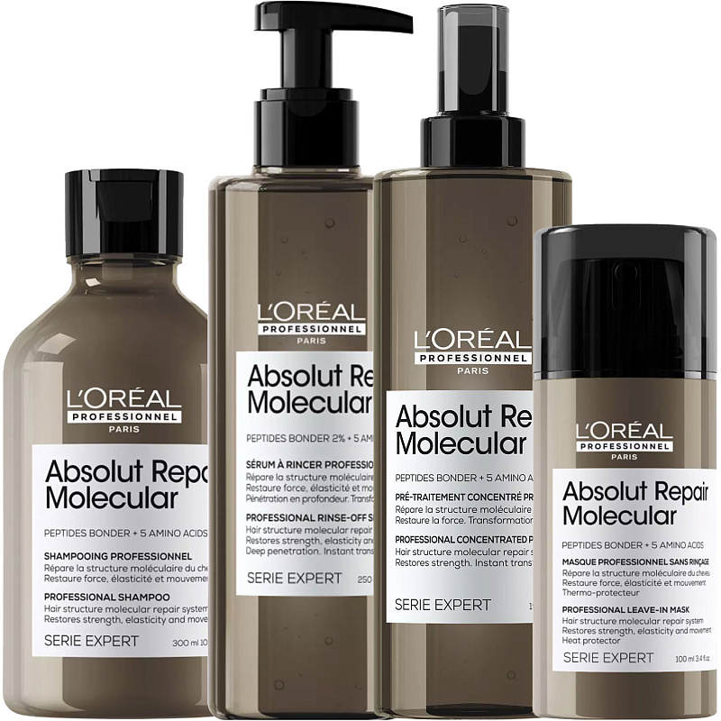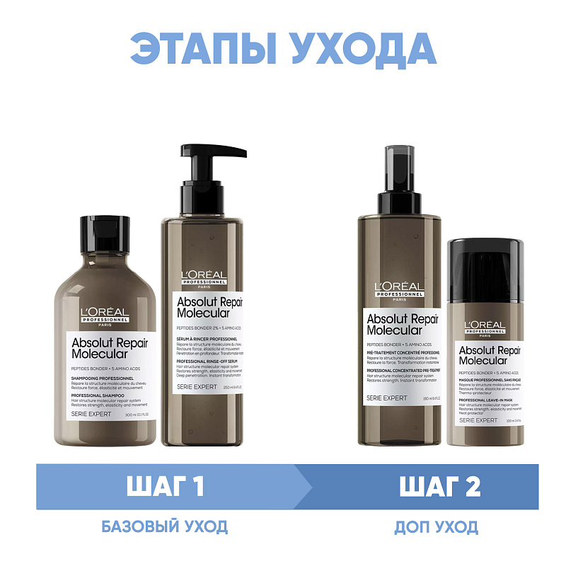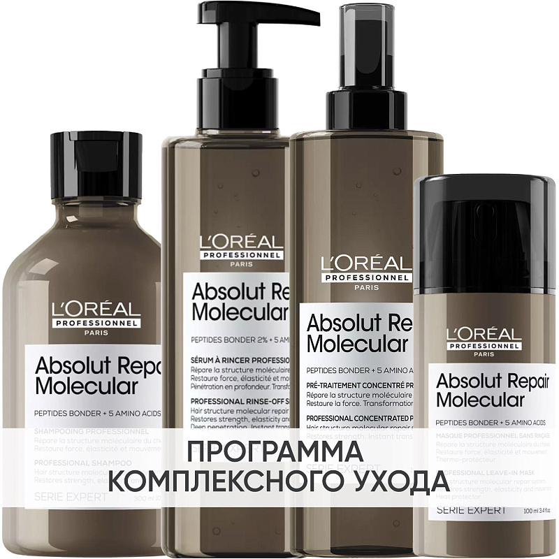 ПРОГРАММА КОМПЛЕКСНОГО УХОДА L'Oreal Professionnel Absolut Repair Molecular для поврежденных волос. Комплексный уход представляет собой дополняющие друг друга средства, совместное использование которых будет максимально эффективным. Первым шагом программы является базовый уход (очищение + питание).