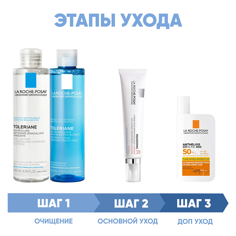ПРОГРАММА КОМПЛЕКСНОГО УХОДА La Roche-Posay Redermic Retinol для борьбы с признаками старения лица. Комплексный уход представляет собой дополняющие друг друга средства, совместное использование которых будет максимально эффективным. Первым шагом программы является очищение, вторым - основной уход. В третий шаг вошли дополнительные средства, усиливающие эффект основной программы и применяемые постоянно или периодически на различных этапах ухода. Набор не имеет внешней упаковки, товары в заказы вкладываются по отдельности.