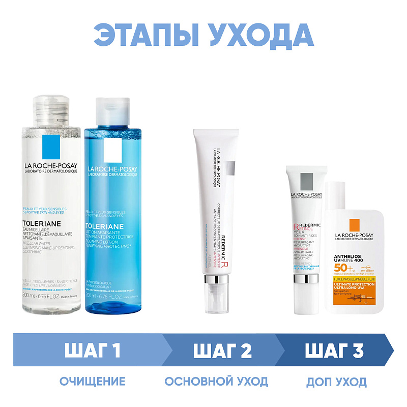 ПРОГРАММА КОМПЛЕКСНОГО УХОДА La Roche-Posay Redermic Retinol для борьбы с признаками старения лица. Комплексный уход представляет собой дополняющие друг друга средства, совместное использование которых будет максимально эффективным. Первым шагом программы является очищение, вторым - основной уход. В третий шаг вошли дополнительные средства, усиливающие эффект основной программы и применяемые постоянно или периодически на различных этапах ухода. Набор не имеет внешней упаковки, товары в заказы вкладываются по отдельности.